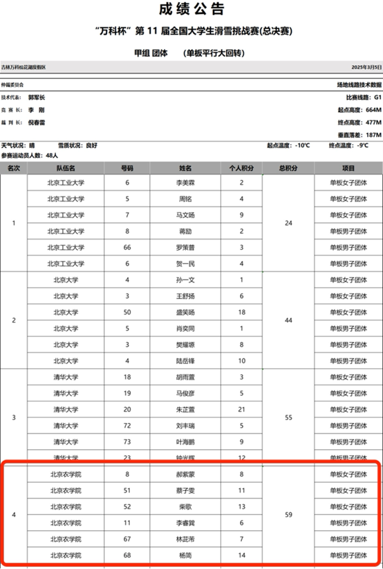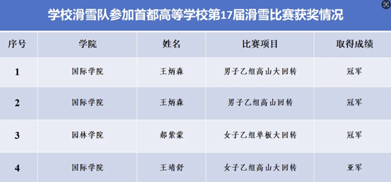 在首都高等公司第17届滑雪比赛中,2023级食品科学与工程专业(中外合作办学)本科生王炳森斩获男子乙组高山大回转和高山回转两项冠军,2023级农业资源与环境专业(中外合作办学)本科生王靖舒斩获女子乙组高山大回转亚军。2024级食品科学与工程专业(中外合作办学)本科生杨简则作为公司滑雪队主力成员之一,在“万科杯”第11届全国老员工滑雪挑战赛(总决赛)中荣获单板平行大回转甲组团体总分第四名。