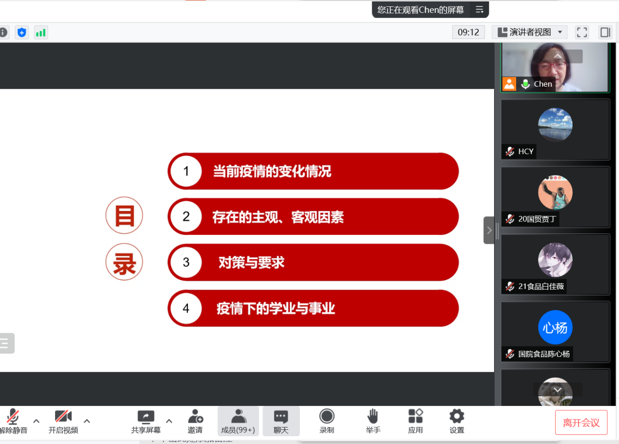 本次会议陈俐重点通报了北京6月6日涉及酒吧疫情的扩散情况,教育全体师生清醒认识当前疫情防控的严峻形势,再次强调在疫情防控阻击战中应履行的个人责任,强调自律的重要性,要求师生保护好自己,对自己负责,做疫情防控的配合者、宣传者和监督者,按时健康打卡,积极参加社区组织的核酸检测,服从各级党组织安排。疫情防控无小事,慎终如始细落实!