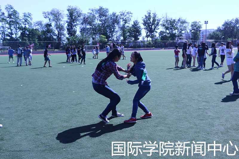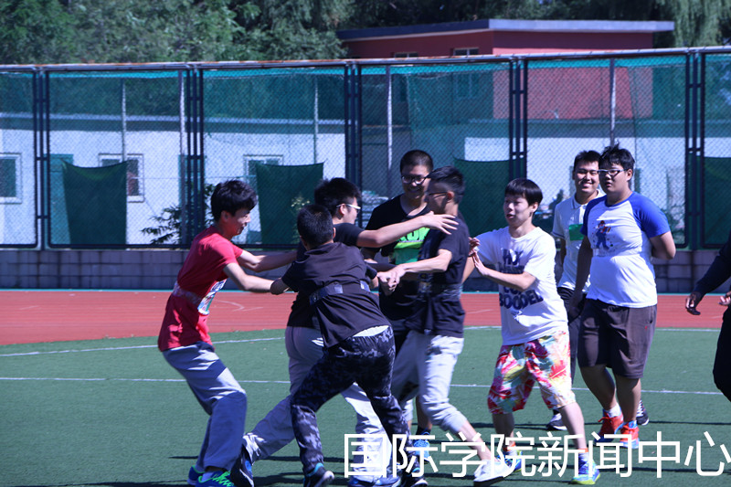 紧接着,此次素质拓展的压轴游戏-----撕名牌,准备开始了。组织人员们拿着剪刀胶带,金色银色的马克笔,在黄色和绿色的纸条写上同学们的名字,贴在他们背后。有的同学为了不被轻易的“撕掉”,用胶带把名牌一圈一圈的绑在身上,像个“木乃伊”;也有的同学想要“挑衅”对方,把名字写成快撕我。这些单纯而又可爱的举动都令人忍俊不禁。贴完名牌,一声开始,聚集的人群一下像炸开了锅似的散落开来,每个人都张牙舞爪地想要撕下别人的名牌,整个操场都布满了大笑大叫的国院同学们。被撕的人坐在旁边津津有味地看别人,幸存的人继续在场上“战斗”。游戏结束了,大家都筋疲力尽的坐在草地上相视大笑,每个人的距离都缩小了,变得亲昵起来。