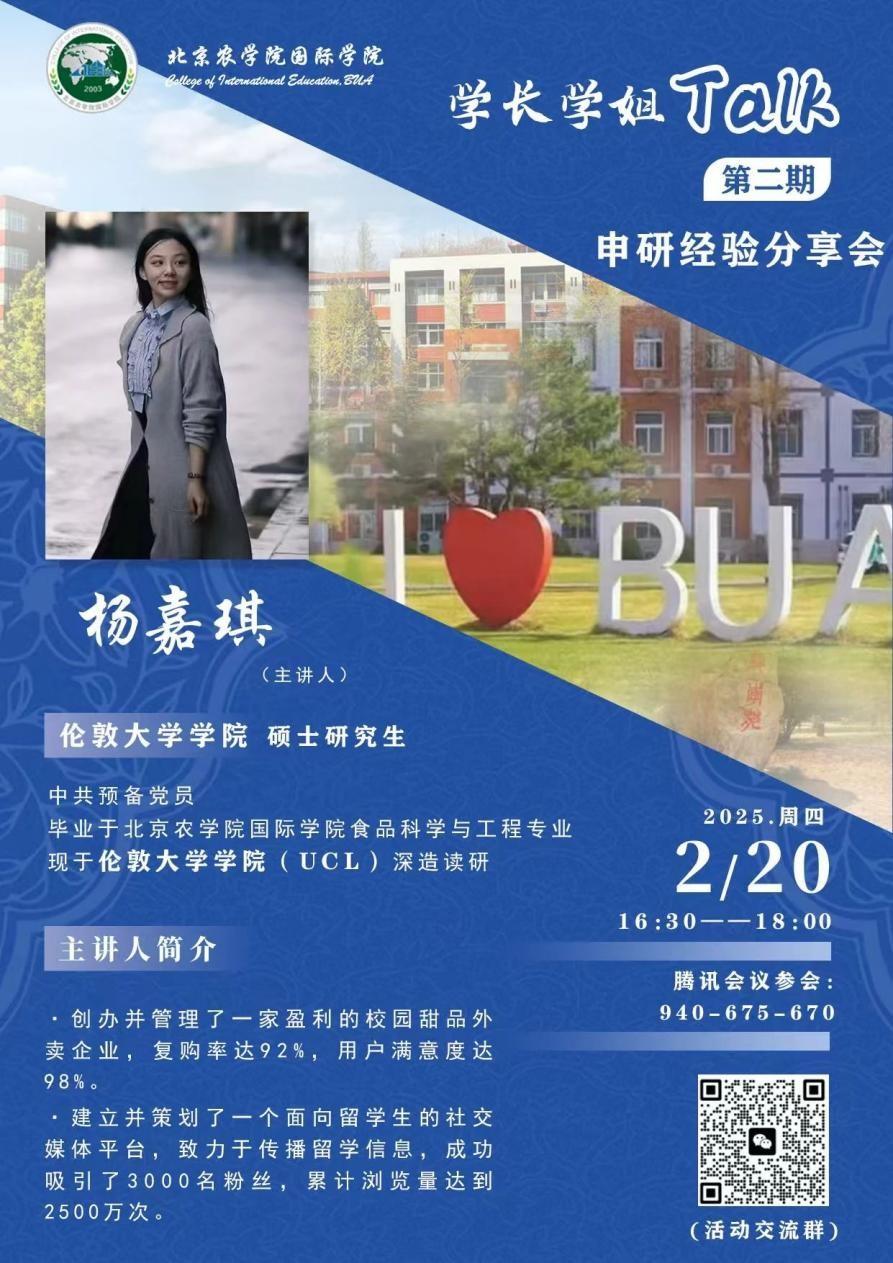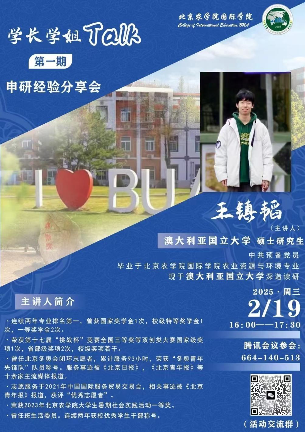 为帮助在校生全方位、多层次、宽领域了解海外申研工作,提高升学质量,yl6809永利聚焦员工发展需求,于2025年2月19日和20日分别邀请了2024年北京市优秀毕业生代表,现就读于澳大利亚国立大学的员工王镇韬、现就读于英国伦敦大学公司的员工杨嘉琪在线举办了两期“学长学姐Talk”海外申研经验分享交流会。
